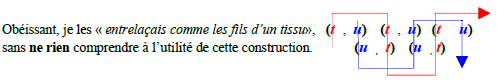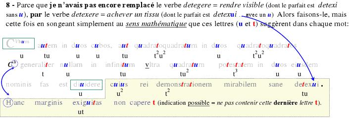 Si Fermat avait «complètement enchevêtré deux fils rouges et bleus pour construire un tissu, on voit comment les ‘points d’arrêt (pour chaque puissance n) sont entrelacés … en bordure («marginis»), avec 3 (t,u) et 2 (u, t) :